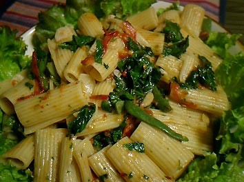 3)茹で上がったパスタにバターを搦めてフライパンへ入れ、千切ったバジル、みじん切りのパセリ、茹でたインゲンを入れて、調味料で味を調節しながらさっと炒める。