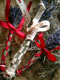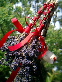 ラベンダーの剪定は5〜6月。剪定を兼ねてついでに収穫し、リボンを使ってスティックを作りました。