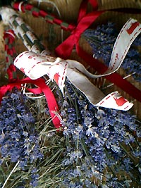 ラベンダーは本当はできるだけ蕾のうちに収穫してすぐ、乾燥させる前にリボンで編んでいきます。リボンで編んだら明るい日陰で陰干しします。直射日光で乾燥させると色が褪せて、香りも飛んでしまいがちに。
