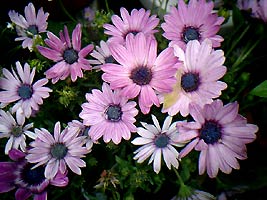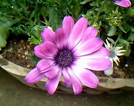 ディモルフォセカ。紫色が華やかです。しかし雨が続くと蕾などにカビが生えやすいので通気性には気をつけます。花を次々と咲かせるので追肥も欠かせません。