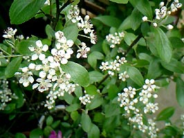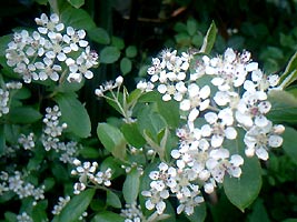 アロニア。小さな林檎のような花がたくさん咲く耐寒性低木。花後は小さくてかわいらしい赤い実がたくさんついて冬にも楽しめます。